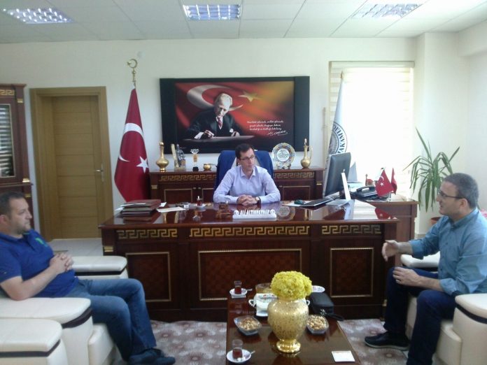 Alucra Devlet destekleri toplantısı öncesi Kaymakam Ali Altınkaynak'ı makamında ziyaret eden Giresun Ticaret ve Sanayi Odası Yönetim Kurulu Başkanı Hasan Çakırmelikoğlu, odamız çalışmaları hakkında bilgiler verdi.