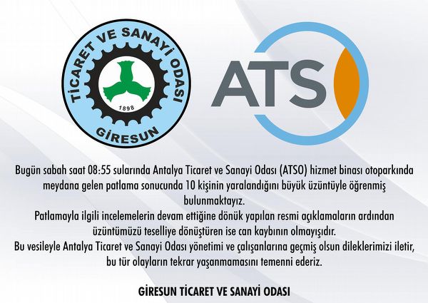 Bugün sabah saat 08:55 sularında Antalya Ticaret ve Sanayi Odası (ATSO) hizmet binası otoparkında meydana gelen patlama sonucunda 10 kişinin yaralandığını büyük üzüntüyle öğrenmiş bulunmaktayız.