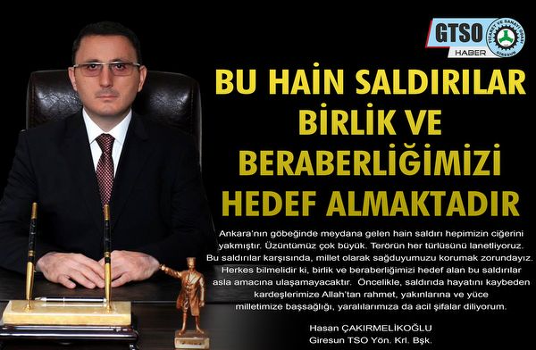 Ankara’nın göbeğinde meydana gelen hain saldırı hepimizin ciğerini yakmıştır. Üzüntümüz çok büyük. Terörün her türlüsünü lanetliyoruz. Bu saldırılar karşısında, millet olarak sağduyumuzu korumak zorundayız. Herkes bilmelidir ki, birlik ve beraberliğimizi hedef alan bu saldırılar asla amacına ulaşamayacaktır. Öncelikle, saldırıda hayatını kaybeden kardeşlerimize Allah’tan rahmet, yakınlarına ve yüce milletimize başsağlığı, yaralılarımıza da acil şifalar diliyorum.