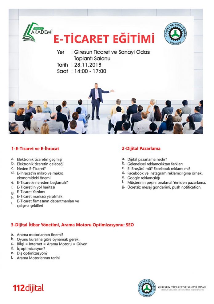 Değerli Üyemiz, 28 Kasım 2018 Çarşamba günü 14:00 – 17:00 saatleri arasında Giresun Ticaret ve Sanayi Odası Toplantı Salonu’nda GTSO Akademi tarafından 112 Dijital işbirliğinde düzenlenecek olan “E-ticaret Eğitimi”ne katılımınızdan memnuniyet duyarız.