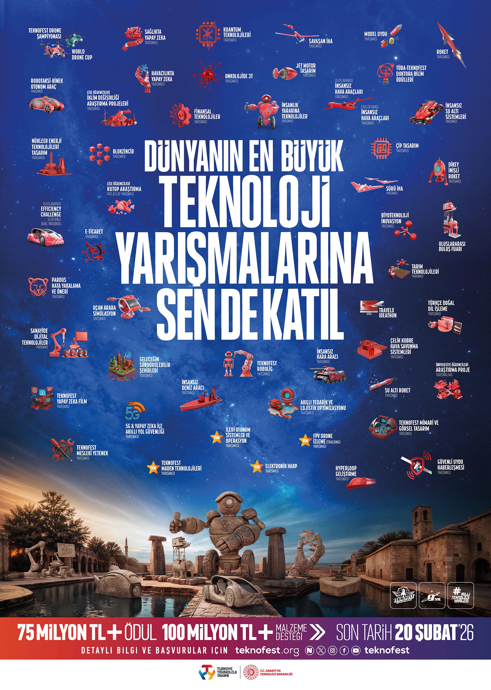 Dünyanın en büyük havacılık, uzay ve teknoloji festivali TEKNOFEST kapsamında düzenlenen 2026 yılı teknoloji yarışmalarına başvurular başladı. Bu yıl yeni adresi Şanlıurfa olan TEKNOFEST, 75 milyon TL ödül ve 100 milyon TL’den fazla maddi desteğiyle genç zihinleri yeni keşiflere davet ediyor. Fikirleri projeye, projeleri geleceğe dönüştürmek isteyenler için yarışma başvuruları ise 20 Şubat’a kadar devam ediyor!