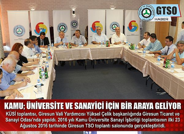 KÜSİ toplantısı, Giresun Vali Yardımcısı Yüksel Çelik başkanlığında Giresun Ticaret ve Sanayi Odası’nda yapıldı. 2016 yılı Kamu Üniversite Sanayi İşbirliği toplantısının ilki 23 Ağustos 2016 tarihinde Giresun TSO toplantı salonunda gerçekleştirildi.