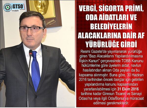 Resmi Gazete’de yayınlanarak yürürlüğe giren “Bazı Alacakların Yapılandırılmasına İlişkin Kanun” çerçevesinde Türkiye Odalar ve Borsalar Birliği Kanunu hükümlerine göre üyelerin aidat, navlun hasılatından alınan Oda payları da bu kapsama alınmıştır. Buna göre, 30 Haziran 2016 tarihinden önceki borçlar için getirilen yapılandırma kanunu kapsamından yararlanılabilmesi için 31 Ekim 2016 tarihine kadar Giresun Ticaret ve Sanayi Odası’na veya ilgili Oda/Borsa’ya müracaat edilmesi gerekmektedir.